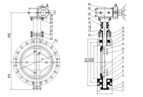 1、本閥采用三偏心密封結(jié)構(gòu),閥座與蝶板幾乎無(wú)磨損,具有越觀(guān)越緊的密封功能。